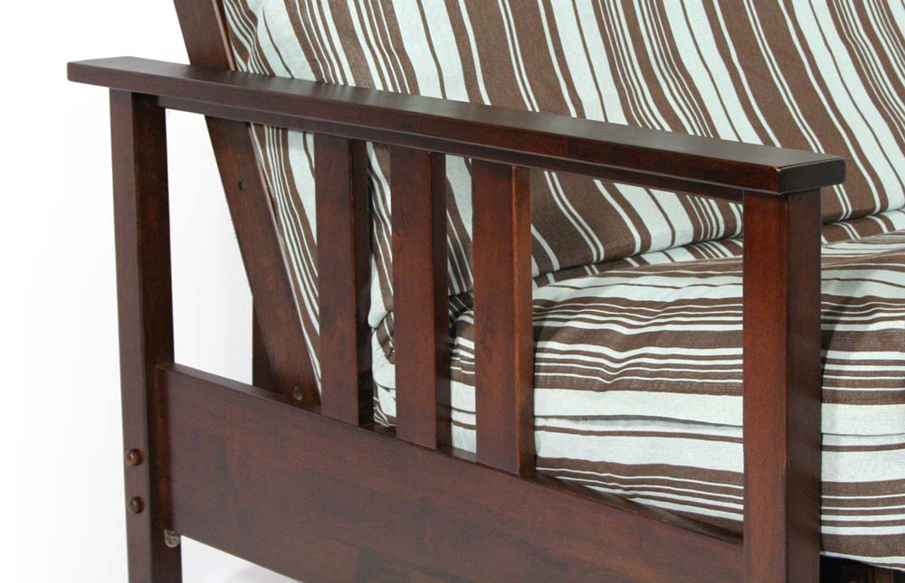 Order The Durango Futon Frame Today and get free shipping! | Although this design may look similar to other mission designs, it offers many additional attributes. The width and thickness of the three arm slats and front legs make this a solid and sturdy design. Being a true Wall Hugger the Durango futon frame allows you to convert the frame from a futon sofa to a bed and back without moving it away from the wall. It also operates entirely from the front which means that you don't need space on the side to get to the back of the frame to operate it. | Frame Construction & Specifications | True Wall Hugger coverts without moving from the wall Hidden Hardware Front Operating / Patented Mechanism One Inch Thick Main Support Boards and Wider Slats Attributes of a Day Bed, Versatility of a Futon