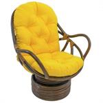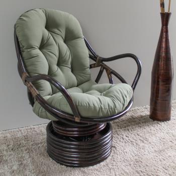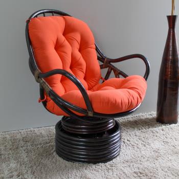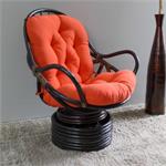 Rattan Swivel Rocker Chair Frame with Solid Twill Cushion This is a Rattan Swivel Rocker Chair. It is constructed of a walnut finished rattan, and includes comfy 6" polyester filled solid colored twill cushion. It's tufted to keep the layers from shifting. it is the thickest and nicest cushion we have ever seen, and it's made in America. Chair Size: 38.5" Tall 28.5" Wide 30.5" Deep Cushion Size: 24" Wide 48" Tall