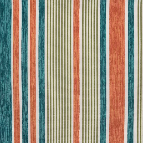 Bacall is a colorful fabric made with variegated greenish blue stripes, peachy orange stripes, and thinner white and olive green stripes.