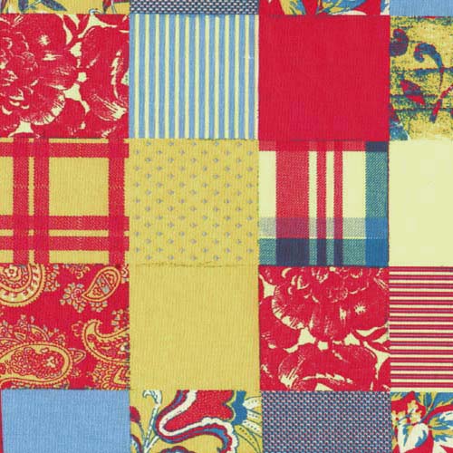 Dixie Patch is a plaid print that looks like a patchwork fabric,with squares of red and blue flowers, stripes, and paisley designs, along with solid yellow and blue squares as well. Very bright and cheery.